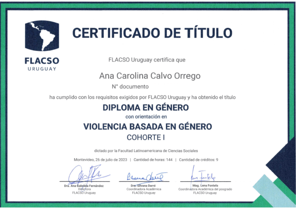 Diploma en Género con orientación en Violencia Basada en Género de la Facultad Latinoamericana de Ciencias Sociales (Flacso), Uruguay, con una duración de 144 horas. Se trabajo la perspectiva de género e interseccional, políticas públicas con enfoque de género, la delimitación y análisis de un problema público de género, la conceptualización de las violencias basadas en género y violencia basada en género en el contexto de pareja.